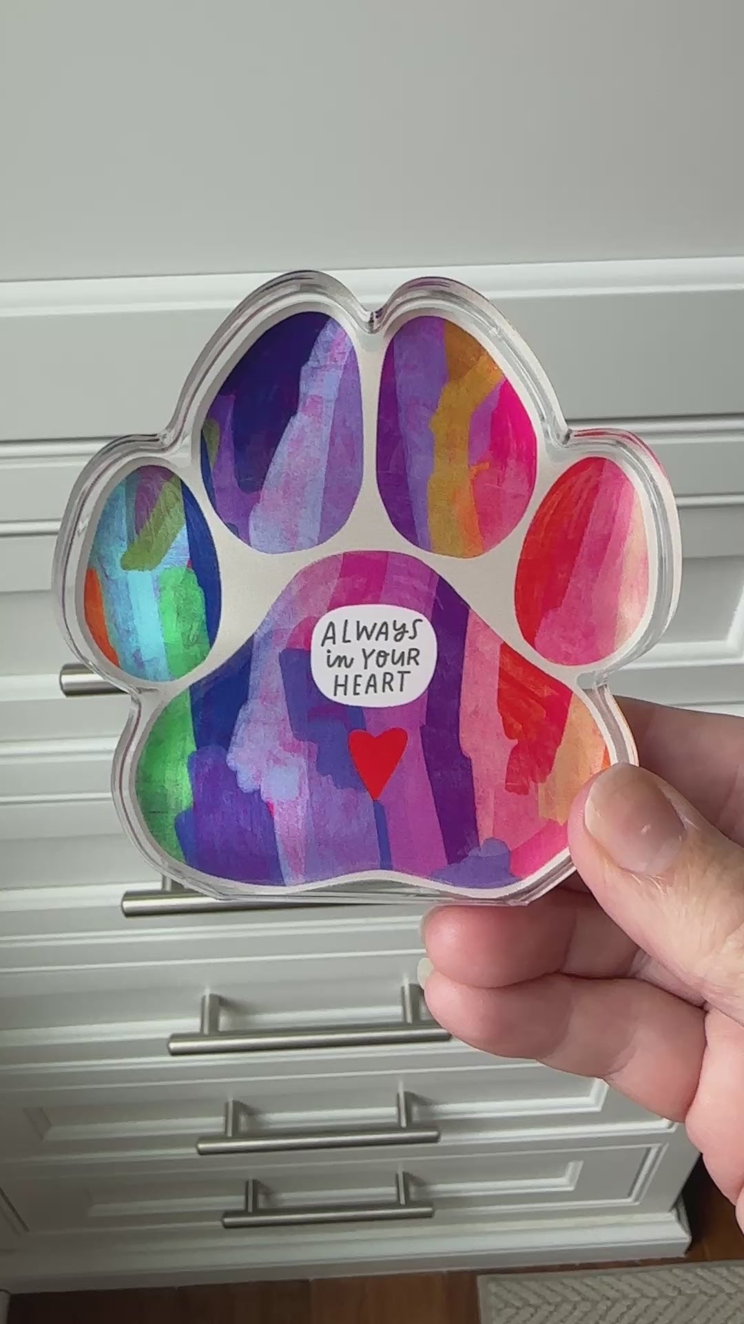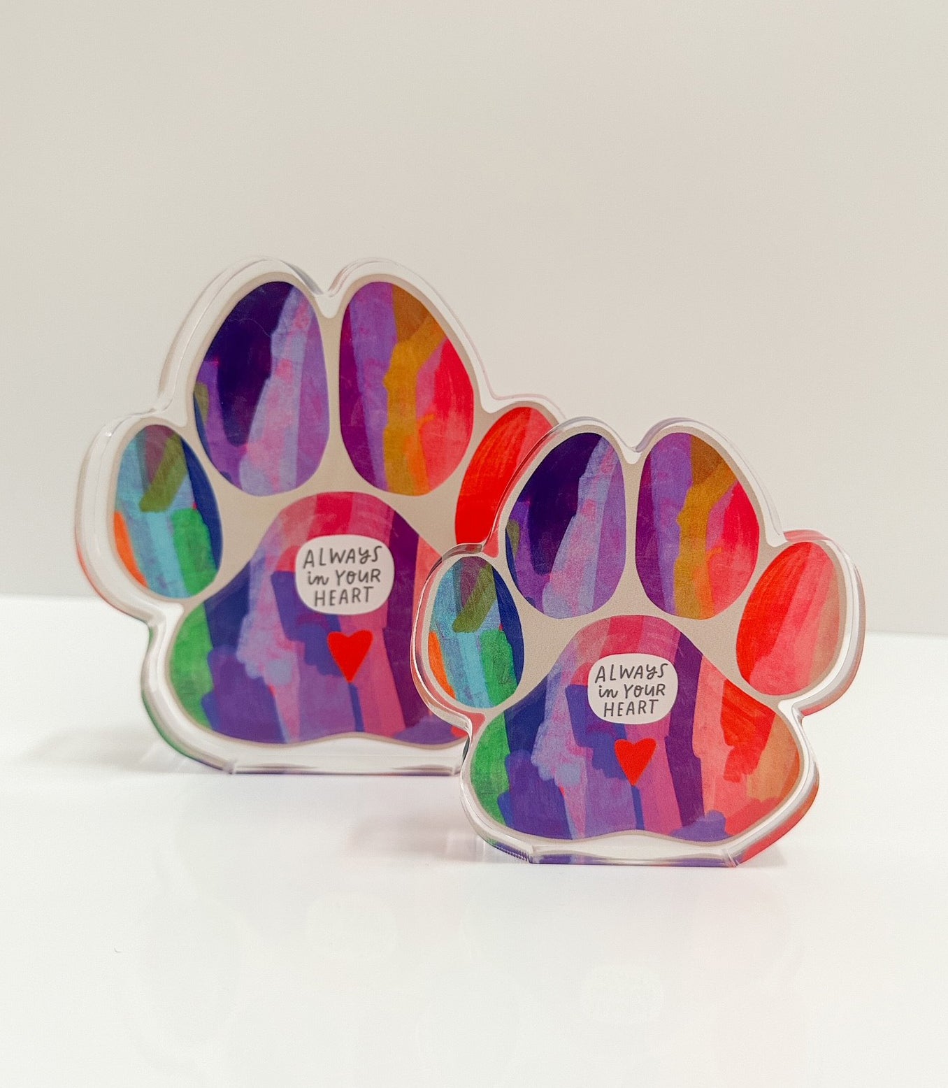 Honor the love that never fades with the Colorful Pawprint Acrylic Art Block. Featuring the hand-lettered words “Always in Your Heart” layered over a rainbow pawprint, this piece is a heartfelt tribute to the special pets who leave lasting pawprints on our lives.