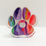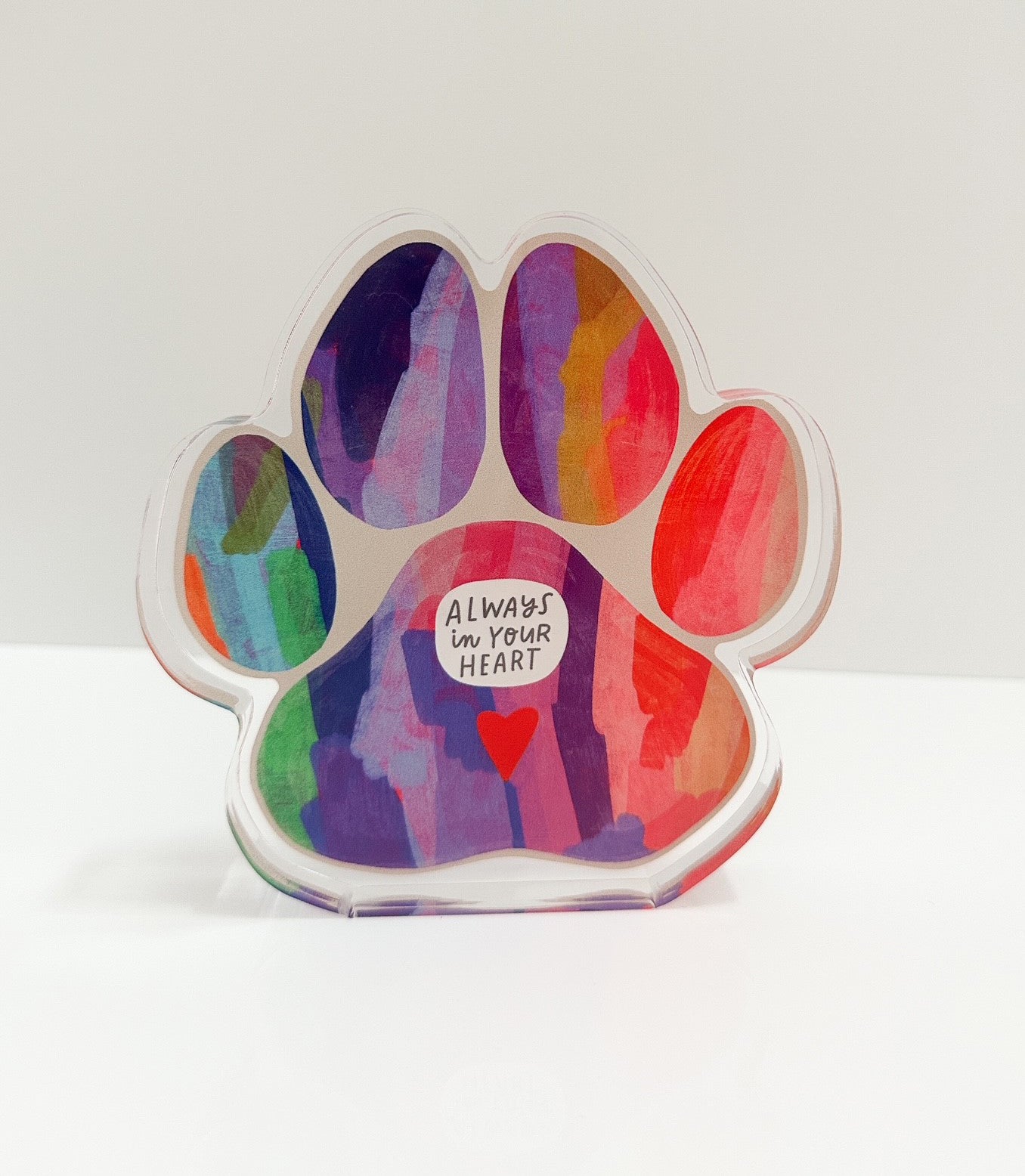 Honor the love that never fades with the Colorful Pawprint Acrylic Art Block. Featuring the hand-lettered words “Always in Your Heart” layered over a rainbow pawprint, this piece is a heartfelt tribute to the special pets who leave lasting pawprints on our lives.