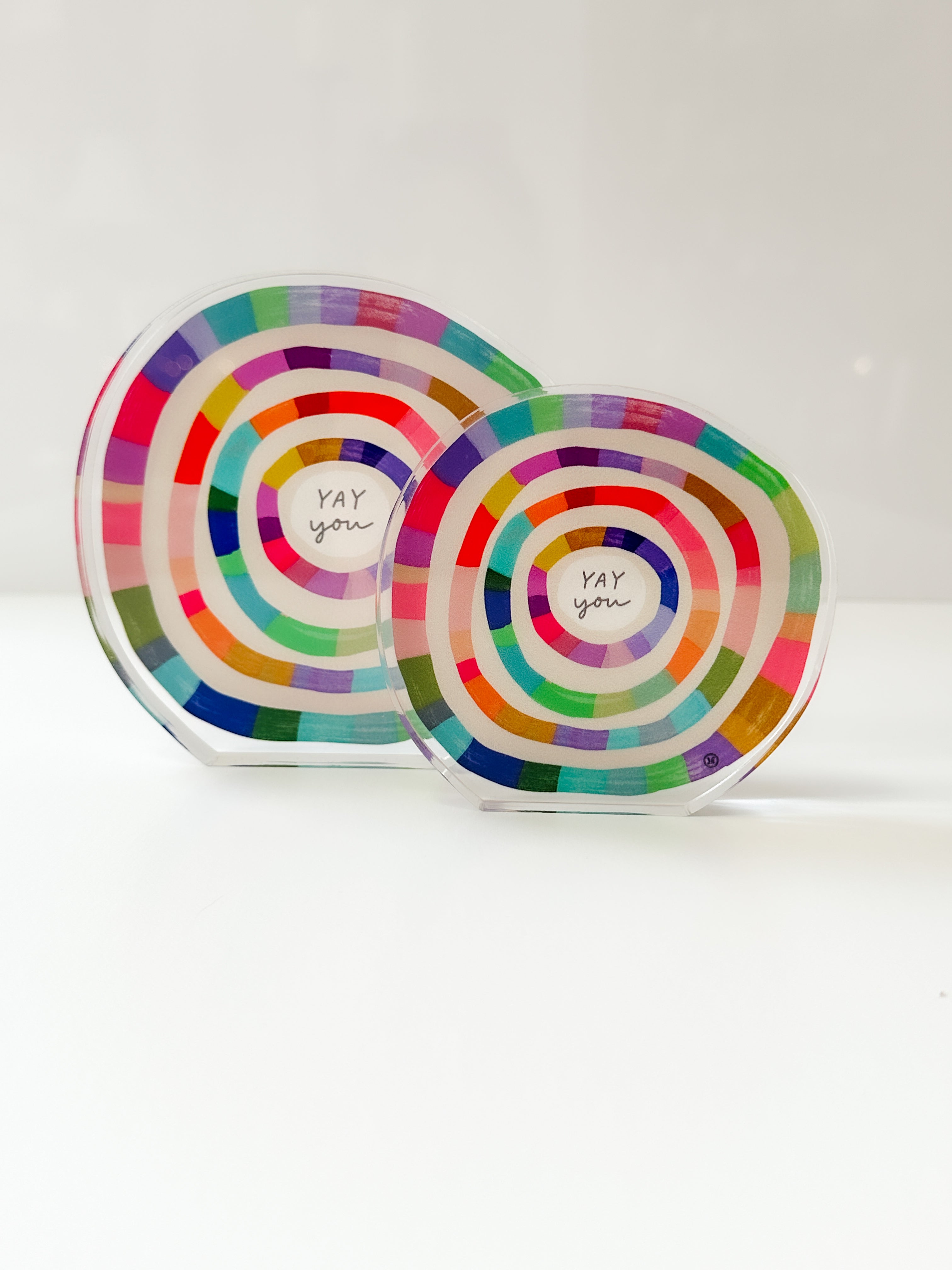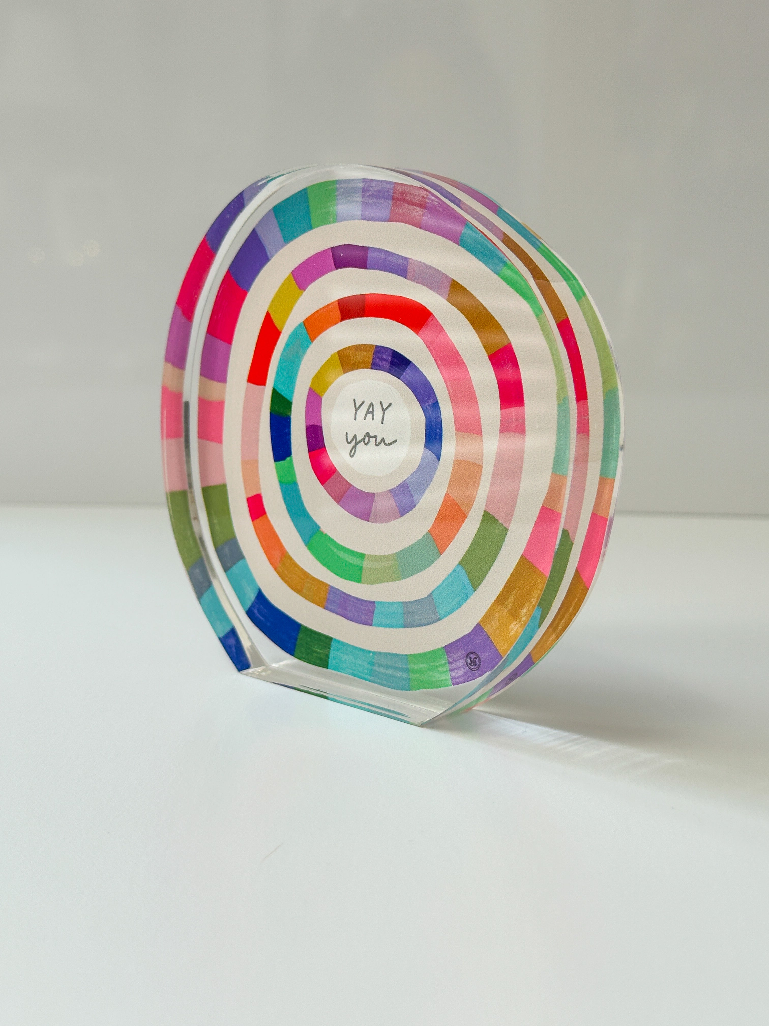 Brighten someone’s day with the Yay You Large Acrylic Art Block – a bold, hand-lettered message surrounded by cheerful, colorful circles. The design is reverse-printed on thick, clear acrylic for brilliant color, clarity, and a dimensional glow that looks stunning on any surface.