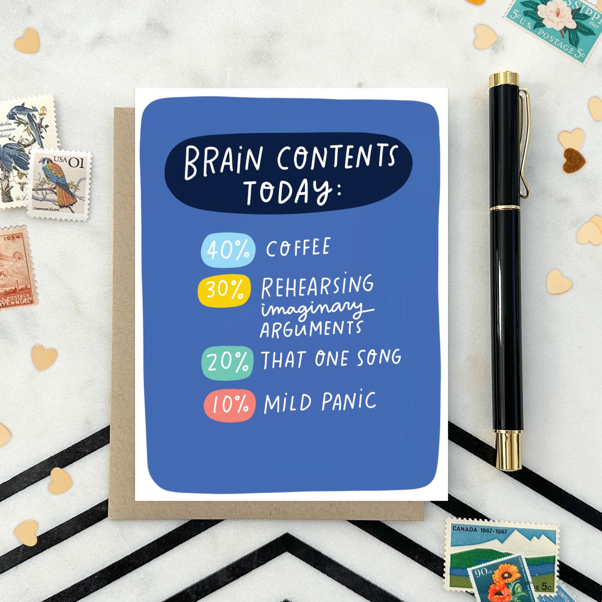 Some days, the brain is just doing its best. This funny and deeply relatable card breaks it down: 40% coffee, 30% rehearsing imaginary arguments, 20% that one song, 10% mild panic. Sound familiar?